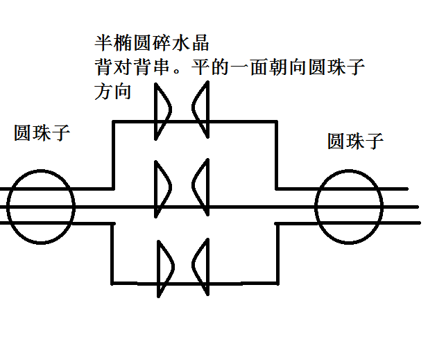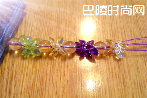 1、如图,碎水晶面对面从三股长线的每一股中穿过,圆形珠子则从三股线中穿过,穿一个珠子,然后六个水晶,再一个珠子,再六个水晶,就这样一直穿。