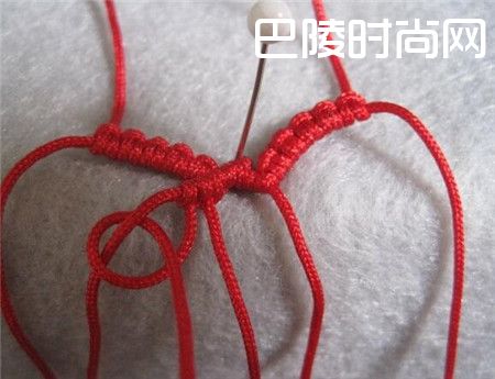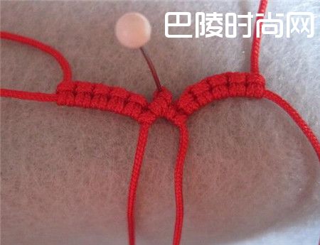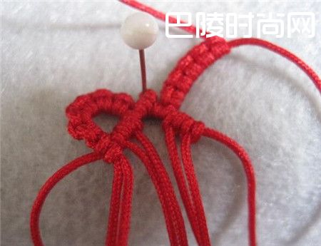 第三步:编好一半后,再拿出一玉线,连接已经编制好的心形固定针处,穿入珠子,继续加玉线,编制另一个心形和手链部分。