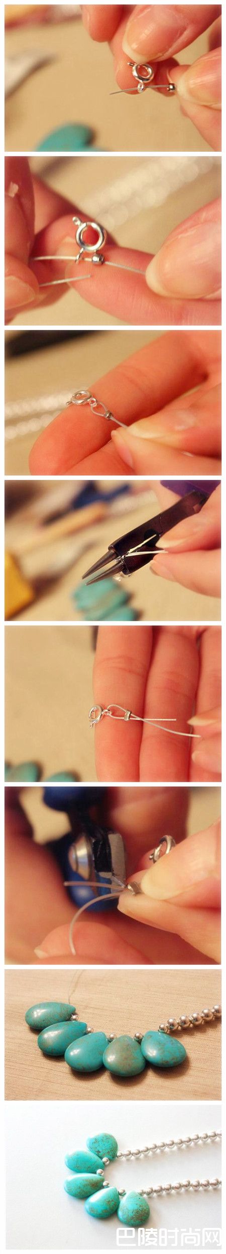 DIY步骤:先穿好项链扣,再把项链珠子和绿松石穿上,再用项链环收尾即可。