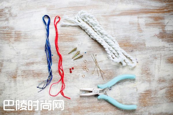 DIY材料:一根白色的粗绳,白色、蓝色细绳适量,红色绳一根,三个金色小挂饰,圆环,圆环针,钳子,剪刀,三个小串珠。