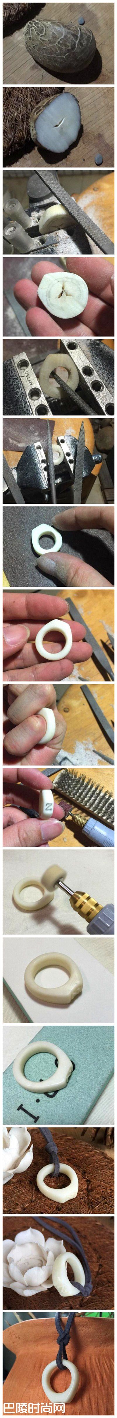 象牙果戒指DIY教程。象牙果是橡扣树的种子胚乳,常见于厄瓜多尔和秘鲁的沿海雨林中。罩胚乳有点像椰子,起初是液体,成熟以后变得坚硬起来,具备了与动物象牙类似的特点,有类似年的环状图案,看起来和真的象牙一样,被人们称为植物象牙。