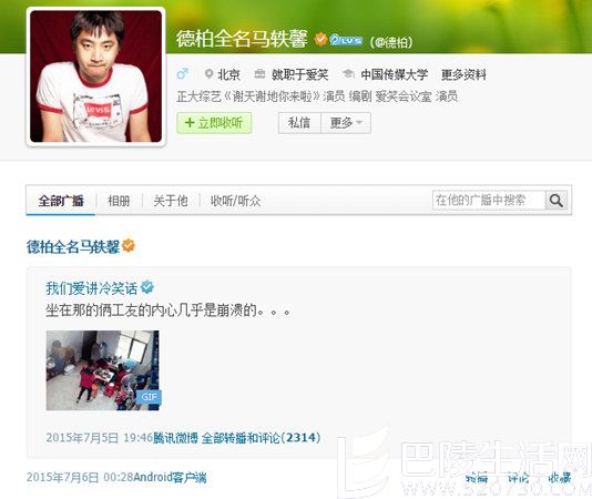 看过《我都爱笑》和《爱笑会议室》的人都知道,爱笑兄弟中有一位叫德柏的喜剧演员,德柏的原名叫马轶馨,那么德柏微博是什么呢?目前新浪微博没有ID认证是德柏,或者是马轶馨,腾讯微博有一个ID叫“德柏全名马轶馨”,简介是“正大综艺《谢天谢地你来啦》演员、编剧、爱笑会议室、演员”,并从以往的晒照可以看出,这应该就是德柏的微博了。