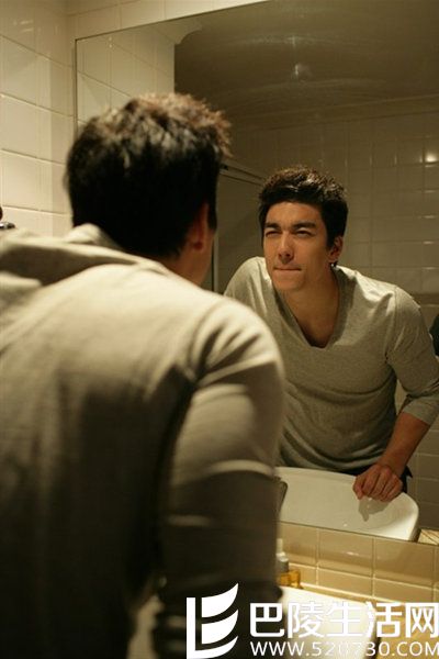 这张是丹尼斯吴较为家居风格的一张写真照片。照片上的丹尼斯吴穿着一件灰色的T恤,看上去非常亲切,他眯着眼睛,紧抿着他的嘴唇,站在镜子前,像是要梳洗的样子。丹尼斯吴的T恤领口较低,可以透过T恤领子看到他性感迷人的锁骨,以及若隐若现的身体肌肉,真的非常帅气。相信大家都会希望在家里能有一个像丹尼斯吴这样的男朋友吧。