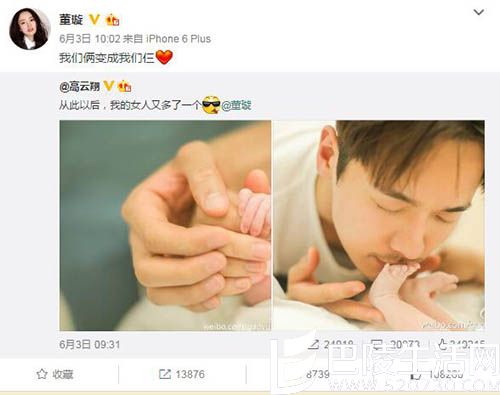 6月3日董璇在微博转发“义渠君”高云翔的微博,董璇微博报喜,还说道:“我俩变成我仨”,图中是三只手,分别是董璇、高云翔还有他们刚出生不久的女儿,一家三口手牵着手,充满了幸福的气息,另外一张图就是高云翔亲她女儿小脚板的照片,这是一个拥有父爱的亲吻,充满了爱意。高云翔的微博也写道:“从此以后,我的女人又多了一个”。
