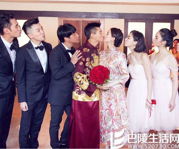 3月20日的婚礼,迎亲环节,吴奇隆身穿龙袍带领伴郎团惊艳亮相。在《步步惊心》中,吴奇隆最后夺嫡成功,登上帝位,也再次彰显着他与刘诗诗因戏生情的含义。迎亲时,小虎队再度合体,合唱成名作《爱》和《青苹果乐园》,即怀旧又应景,气氛热烈。刘诗诗身穿龙凤褂,气质脱俗,美艳无比。而刘诗诗身边的则是“步步惊心”伴娘团刘心悠、叶青和郭晓婷,一个个美到不行。接到新娘后,和传统婚礼一样,新人甜蜜接吻,向双亲斟茶,吴奇隆妈妈送金饰给刘诗诗,一切都甜蜜无比。