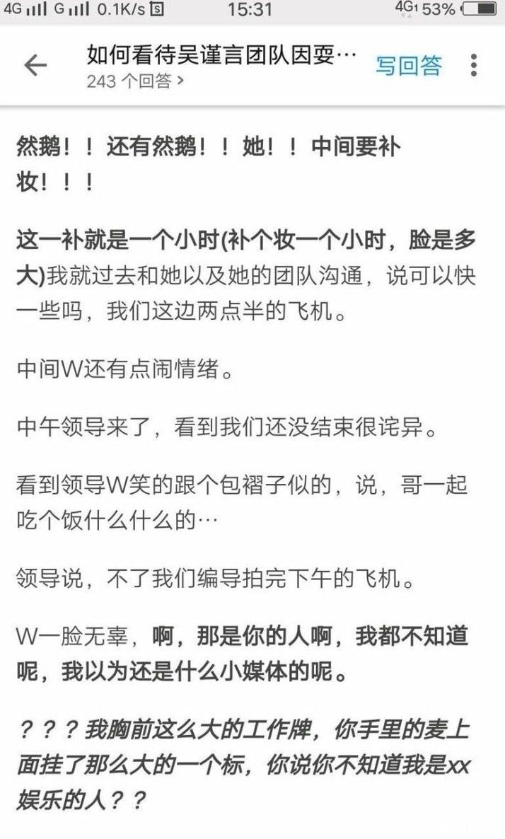 这位业界人士的爆料已经删除,但早就被网友备份,文内开头便说看到事件上热搜,感觉出了一口气!很!爽!爆料者透露8月上旬接到外出采访的任务,事前与W的团队讨论好,桥段设定在清晨突击下榻饭店,采访团队清晨4点便起床准备工作,W在6点起床,化看起来像是刚睡醒的妆。