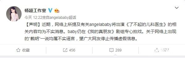 而Angelababy工作室在3日发布声明,否认Angelababy将演出《了不起的儿科医生》,并澄清关于网路上的抢了李沁女主角位置截胡一说,均属不实谣言,目前她仍忙着拍摄新戏《我的真朋友》,并希望停止传播相关的虚假信息。