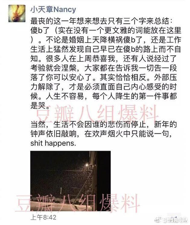 陆网疯传一个声称是奶茶妹妹的朋友圈发文截图,最丧的这一年想来想去只有三个字来总结:傻b了(实在没有一个更文雅的词能放在这里)。不论是婚姻上天降横祸傻b了,还是工作生活上猛然发现自己早已在傻b的路上而不自知。很多人在上周恭喜我,还有人说经过了考验就会涅槃,大家都在告诉我一切告一段落了你可以安心了。其实恰恰相反。外部压力解除了,才是必须直面自己内心感受的时候。人生不容易,每个人降生的第一件事都是哭。当然生活不会因谁的悲伤而停止,新年的钟声依旧敲响,在欢声烟火中只能说一句,shit happens.截图上的大头照和网路昵称,和前次中秋节朋友圈外流的截图是一样的,不过仍未能证实是出自章泽天之手。