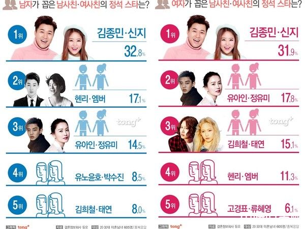 韩国婚姻情报公司duo做了一项调查,以605名未婚男女为对象,选出韩国演艺圈代表的男性朋友、女性朋友明星,意指有着纯友谊的男女明星。