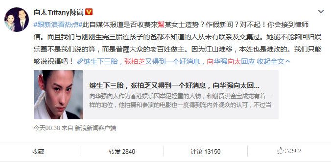 向太在微博上澄清自己从未说过要帮张柏芝重返演艺圈,而且我与刚刚生完三胎、连孩子的爸都不知道的人从未有联系及交集过,她能不能够回归娱乐圈不是我说了算,而是普罗大众的老百姓做主。因为江山难移,本性也是难改的。我只能够说祝福吧!