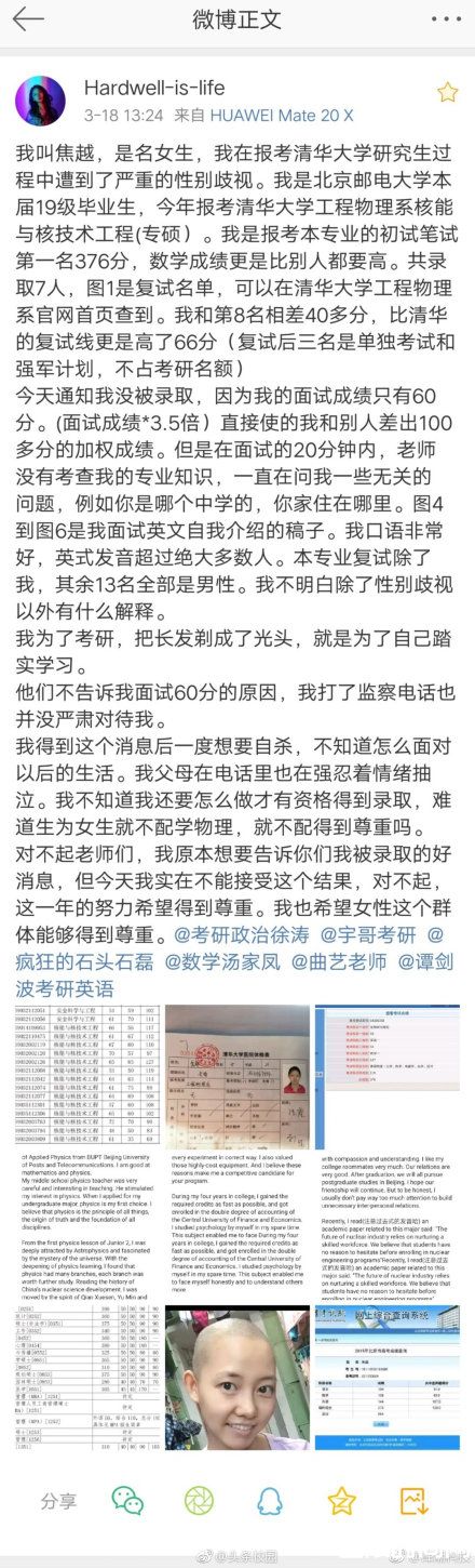 焦越,报考了清华大学工程物理系核能与核技术工程专硕研究生,她原来是北京邮电大学毕业生,因为复试也就是面试的时候只得了60分,自己认为不公平难道因为面试的时候除了自己剩下的全都是男生自己就应该被刷下来吗?因为微博内容提到了性别歧视所以受到了极大的关注。