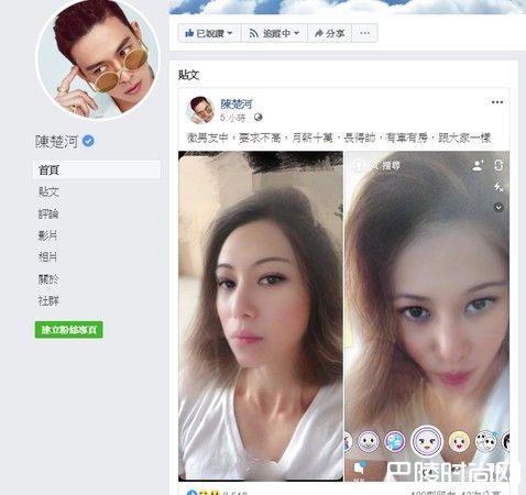 男星陈楚河凭藉《爱上哥们》受到大票观众喜爱,事业一飞冲天,拥有高人气的他,平时也常透过社群网站,分享一系列工作、生活点滴,不过近来更新频率较少,拒离他上一次在脸书发文,已经是4个月以前的事情了。没想到,他16日难得发文,一连晒出2张自拍照露脸,文中却写道征男友中,令不少网友乍看之下吓了一跳,在网路上意外引发讨论。