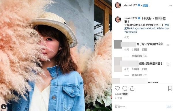 谢忻8日在IG发文,写道:我爱你,关你什么事?千怪万怪也怪不到你的身上去。 这是引用张爱玲《沉香屑•第一炉香》的名言佳句,她还附上一张遮住半脸的文青照,当时不少人对她的发言摸不着头绪,但当偷吃风波爆发后,有眼尖网友发现照片中她穿的就是和阿翔接吻当天的服装,且背景就是在两人见面的花店门口,再比对发文时间,的确就是和激吻阿翔的日期是同一天。