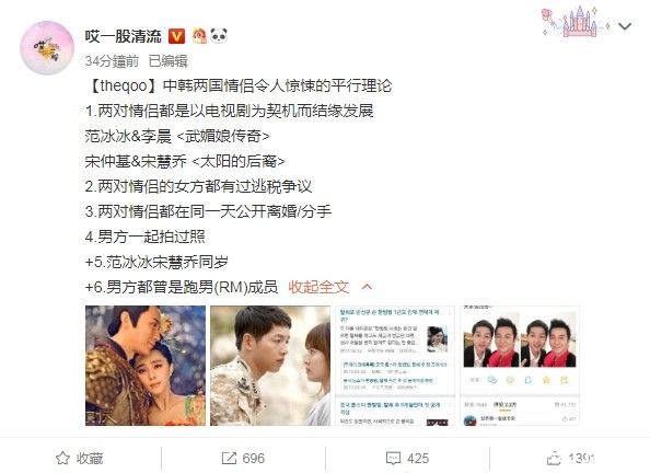 此外,网友更陆续挖出2对夫妻、情侣档的共通点,包括范冰冰、宋慧乔都是37岁,两人都是拍戏擦出爱火、女方都爆出逃税争议,男方一起拍过照、同一天宣布离婚分手、男方同是《跑男》系综艺节目成员。加上国师唐绮阳发现这两对都有一位是处女座,总共有7个共通点成为外界焦点。