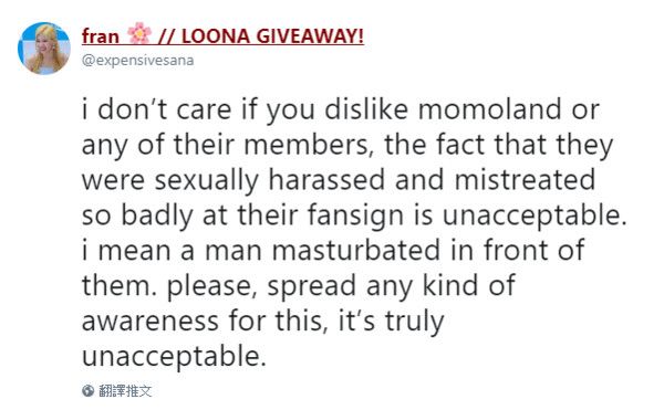 消息传开后不只当天有在现场的人生气,未到场的其他国家粉丝看了文章都相当气愤,怎料却有人说谁叫她们穿那么性感,让其他粉丝直呼实在是太过分了,因此在推特上发起RespectMomoland的话题活动,就是希望可以不要再有一样的事情发生。