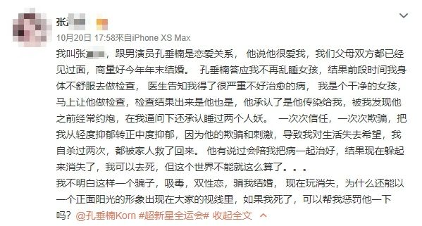 男星孔垂楠今年28岁,2011年拍摄青春电影出道,外型俊俏、形象阳光,拥有不少女性粉丝。然而,一名张姓女子20日在微博爆料,表示自己是孔垂楠论及婚嫁的女友,因身体不适去看医生时,惊觉染病,检查之下发现是被男友传染,指控对方四处约人上床,震撼言论在网路上引起一阵讨论。