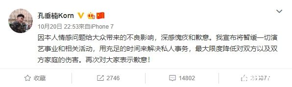 而孔垂楠在20日深夜也发文表示,因本人情感问题给大众带来的不良影响,深感愧疚和歉意。我宣布将暂缓一切演艺事业和相关活动,用充足的时间来解决私人事务,最大限度降低对双方以及双方家庭的伤害。再次对大家表示歉意!