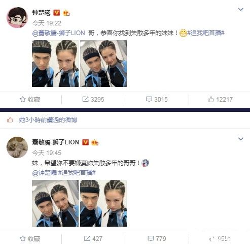 钟楚曦8日晚间在微博贴出与萧敬腾的合照,标记了对方并写下:哥,恭喜你找到失散多年的妹妹!,照片里可看到2人穿着一样的衣服,绑起一样的辫子头,收起下巴一起瞪着镜头,眉目与五官竟真有几分相像,不久后萧敬腾回覆她我的妈呀!我亲妹都没那么像! 爸!快来看!逗趣的互动引起不少网友关注。