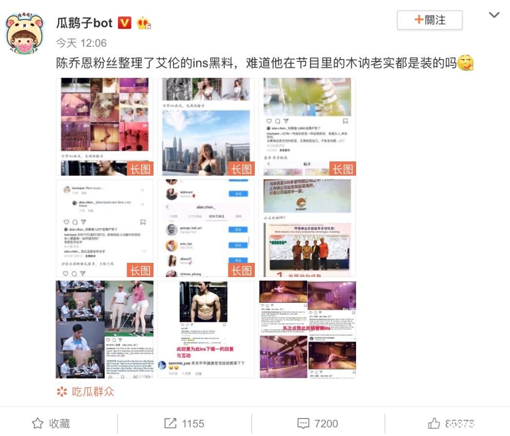 然而陈乔恩公开认爱的消息传开后,就有网友翻出艾伦之前在IG上关注了许多身材姣好的妹子,该篇文章中也提到:尤其他(艾伦)特别好色,在ins上勾搭各形各色的大胸妹子聊天约会,通过打高尔夫和看画展来约见面,ins上面互关大量私密用户女性,还包含互关、点赞、评论卖情趣内衣、赌球陪聊女、夜店跳钢管舞女、离异带二娃女等等,更揭露艾伦和这些女性暧昧不清。