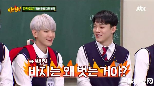 EXO近来为宣传新专辑出演节目《认识的哥哥》,其中一段被问到成员间对彼此的不满,CHEN立刻转头对伯贤说:你为什么要脱裤子?让现场立刻爆出笑声。伯贤自己也忍不住笑出来,随后解释:偶尔练习结束的时候,大家都还不走,我现场换裤子是要提醒大家『该走了』。