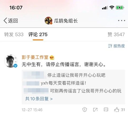 对此,《新浪娱乐》向彭于晏工作人员求证,对方否认:无中生有的事,不做过多的回应。两位都是好演员,请多关注两位演员的作品。彭于晏工作室也使用官方帐号,直接回覆转发结婚传言的微博营销号:无中生有,请停止传播谣言,谢谢关心。
