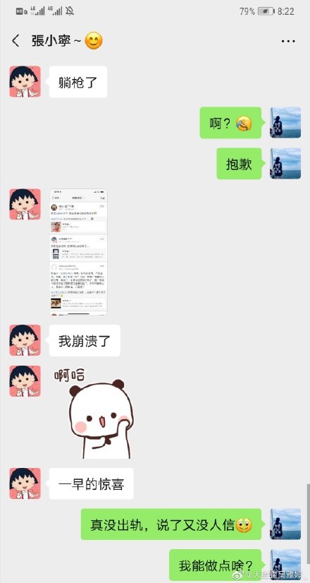 而王栎鑫无预警抛出离婚消息后,就被爆出是他出轨,对象则是在《如懿传》饰演颖妃一角的张佳宁,传闻闹得沸沸扬扬,正宫吴雅婷15日在微博发文表示: 没出轨没爆料没实锤,孩子们很好,我们也挺好,麻烦大家不要打扰我们的朋友哈,关心都收到了,谢谢了!并晒出与张佳宁的对话,只见对方无奈表示: 躺枪了、我崩溃了,她则回应:真没出轨,说了又没人信。