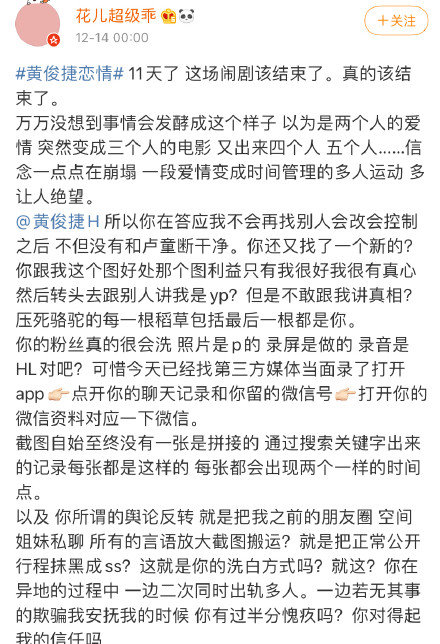 近日花儿超级乖再度发文:我累了我退出这场多人游戏,看的出来除我以外,你的每个女朋友都被你说服了。祝你早日凑够后宫三千早日『登基』,我不行我太介意了我觉得脏。虽然女方多次发文踢爆内幕,却遭外界质疑炒作,她难过表示:我到现在一分钱没拿到,反而一直在自费到处跑到处取证,可笑的为了证明一件真的事情是真的。