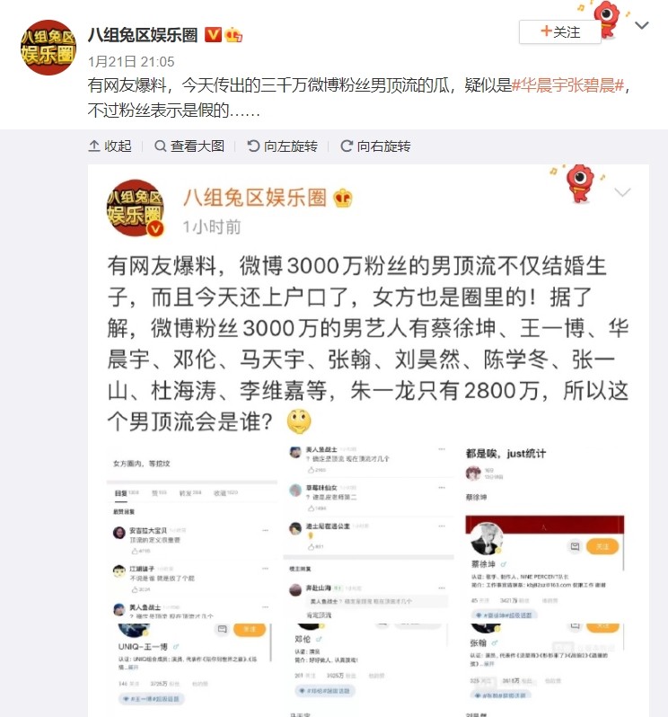 有大陆网友在论坛爆料,声称一位顶流男艺人隐婚生子,老婆也是圈内人,小孩已经1岁,在21日去报了户口。至于怎么能证明是顶流?爆料网友强调肯定是顶流,并提示这个男艺人微博粉丝数超过3000万,使得王一博、蔡徐坤、华晨宇、邓伦、张翰等人都被点名。