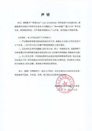 Angelababy火速透过工作室发表3点严正声明,第一严厉抵制该等毫无底线的恶意炒作行为。杨颖女士与他人不存在任何不正当关系;第二是要求相关主体即刻删撤不实言论,停止一切侵权行为;第三是透露工作室已经委托律师事务所处理,现在已经完成公证取证工作。而爆料微博现在已经看不到影片。
