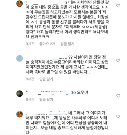 A某表示只要看到穗珍出现在电视上,就觉得恶心,妹妹更是听到(G)I-DLE的歌就会感到很痛苦。根据A某不只在论坛发文,也在Instagram贴出自己的妹妹(동생,韩译也有可能是弟弟)所遭受的一切,A某妹妹与穗珍是国中同学,穗珍却带头霸凌妹妹,把我妹妹及我妹妹的朋友叫到厕所互打巴掌,后来还传讯息跟所有人说『从现在开始排挤OOO(A某妹妹)』。A某强调会把文字详细整理好再上传。