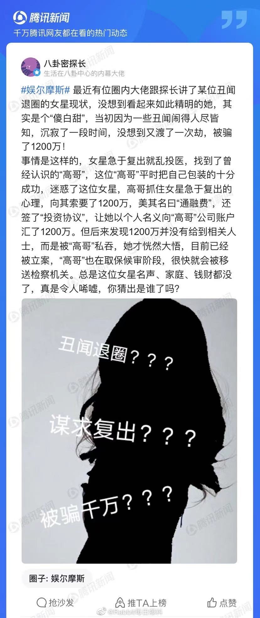 陆网近来疯传一则2019年的爆料,表示有某位丑闻退圈的女星急于复出却乱投医,找一位熟人高哥帮忙,没想到对方却以她急于复出的心态,向她索要了通融费1200万,还签了投资协议,然而后来却发现1200万并未真正给到相关人士,而是被高哥私吞,让她气炸提起法律程序。