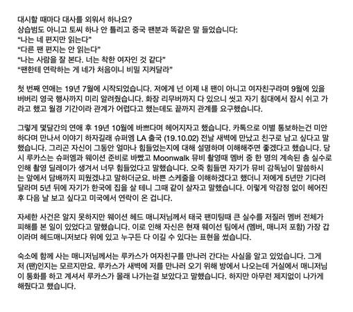 爆出Lucas吃软饭的第一位南韩女粉丝,26日再度上传一则长文,文内透露中国粉丝所说的我只读了妳的信、我很会看人,妳是善良的女孩等Lucas的话术,都与她历经的事情相似,两人在2019年7月开始交往,在这段期间男方曾提前告诉她英国活动行程,甚至在她碰上生理期不方便时,Lucas坚持发生性关系;短暂交往3个月,同年10月,男方用Kakaotalk提分手,却告诉她因为感到抱歉,所以想要见面谈谈。