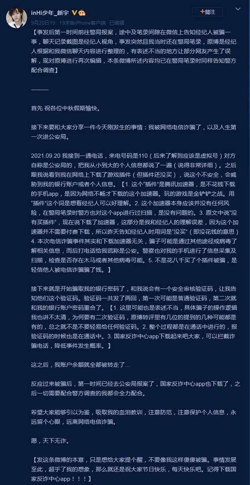 王新宇20日接到一通电话,对方声称是公安局,并将从小到大的个人资料都说了一遍,接着对方说看到他网路下载游戏外挂程式(加速器)不安全,要他发一个审核验证码,结果连发两次后,意外被套出了银行帐户密码,这之后,我帐户余额就全都被转走了……。他向经纪人哭诉我死了!我被诈骗了,我在公安局,我不活了……,透露银行余额8587人民币。