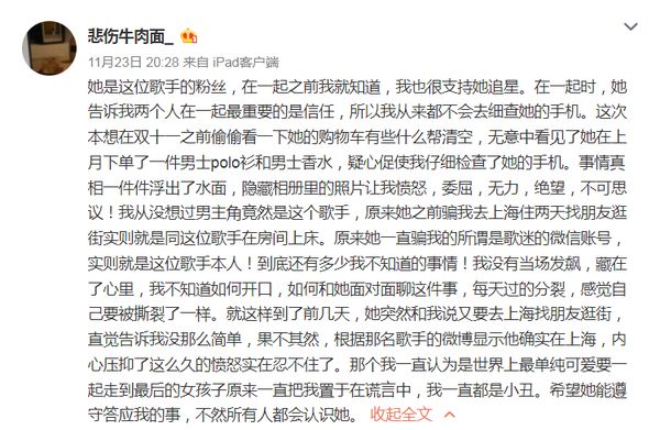 微博网友悲伤牛肉面_23日晚间爆料,自己23岁的女朋友出轨与一名香港男歌手交往,他透露女友本就是该歌手的粉丝,自己也很支持对方追星,直到购物节前夕,原本想偷偷帮女友买礼物,却意外在对方的购物车清单中看见男士polo衫和香水,他为此起疑细查,发现了女友的隐藏相簿,我从没想过男主角竟然是这个歌手,原来她之前骗我去上海住两天找朋友逛街,实则就是同这位歌手在房间上床。