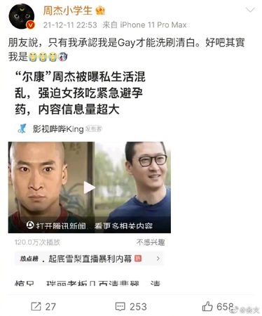 周杰截图遭指私生活混乱的报导,并发文朋友说,只有我承认我是Gay才能洗刷清白。好吧其实我是,同时加上3个哭泣表情,和1个笑脸。有网友好奇问大胆猜测,不会是有人想搞你吧,他回我是Gay当然有人想搞,有人留言你这个Gay看起来有点钢铁直男,他再回讨厌讨厌讨厌这么明显看不出来吗。