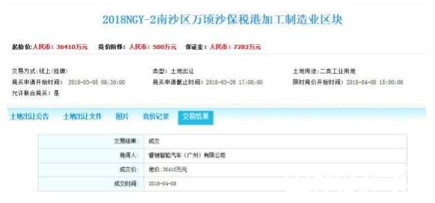 广州市公共资源交易中心公开信息今日显示,睿驰汽车是以底价3.641亿元拍得广州市南沙区万顷沙保税港区内一块约601亩的制造业用地。睿驰汽车工商信息显示,该公司成立于2018年2月12日,注册地为广州市南沙区海滨路171号9楼,法人代表王志刚,法人股东为Smart Mobility (Hong Kong)Holdings Limited。