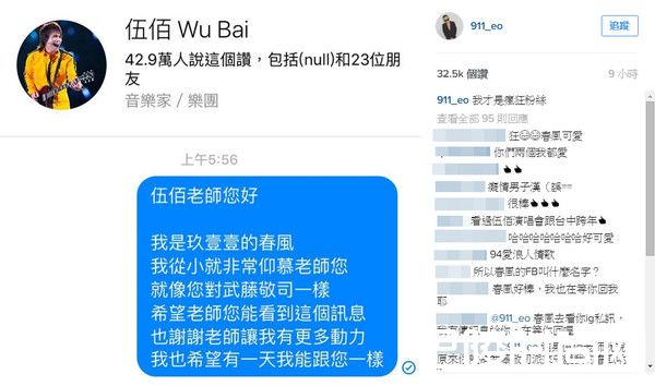 其实,春风曾透露自己的偶像就是伍佰,更称自己是疯狂粉丝,只见他分享的照片,就是他亲自私讯对方的截图,他还相当有礼貌地说:我从小就非常仰慕老师您,就像您对武藤敬司一样,希望老师您能看到这个讯息。他也大方透露将伍佰当成榜样。