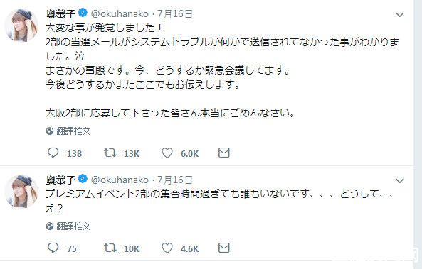 后来才惊觉,原来是通知歌迷中选的E-mail系统出了问题,没有任何一封中选通知被发出,当然也就没有任何人到场,奥华子紧急透过推特及官方网站承认错误,并承诺会择期再次举办公演,不让幸运歌迷乌龙错过与她相见的机会。