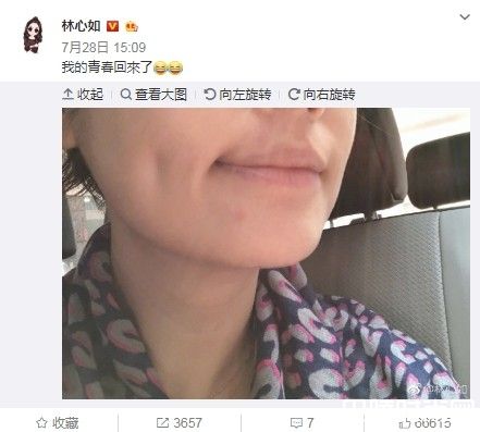 林心如在微博分享素颜自拍照,先是近距离自拍鼻子以下部位,隐约可见一颗粉色青春痘,让她自嘲:我的青春回来了!不久后又上传一张灯光昏暗的半脸自拍照,虽然没有正面全脸示人,但2张照片仍可清楚看见她的皮肤滑嫩,毫无皱纹和坑洞,42岁还是美得出水。