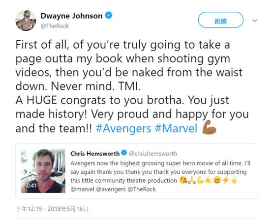 巨石强森还透过影片向克里斯汉斯沃爱的告白,期待未来有机会合作,不过最后不忘强调记得,你只是第四名!,这段生日祝福短短一天就有突破两百万人点阅,笑翻一票网友!