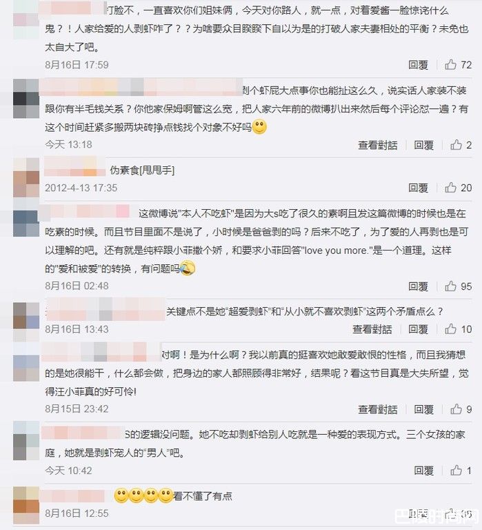 不过,也有粉丝力挺,指出大S会说自己不吃虾,可能是因为当时的她还在吃素,近年来才开始吃荤,而且节目里面不是说了,小时候是爸爸剥的吗?后来不吃了,为了爱的人再剥也是可以理解的吧。在网路上掀起正反两面说法热议。