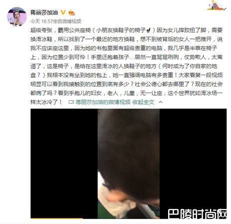 港星陈浩民与大陆艺人蒋丽莎结婚7年,育有3女1男,婚后老婆多数时间都居住在香港,负责照顾儿女,女儿日前在溜冰场受伤,她随即带着小孩到场边换鞋,没想到一坐下,就被身后绑着马尾的女子推开,甚至还责骂她,坐了自己的包包,担心包里的电脑坏掉,蒋丽莎随即出声与对方理论,还把全过程拍下PO到微博上。