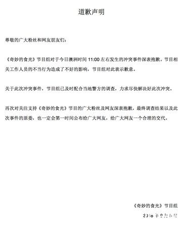 风波越闹越大,《奇妙的食光》在5日下午透过微博,发表了一则道歉声明:节目相关工作人员的不当行为造成了不好的影响,节目组对此表示歉意。关于此次冲突事件,节目组已及时配合当地警方的调查,力求尽快解决好此次冲突。等到最终调查结果出炉,节目组也承诺会第一时间公布给广大网友,给出一个合理的交代。