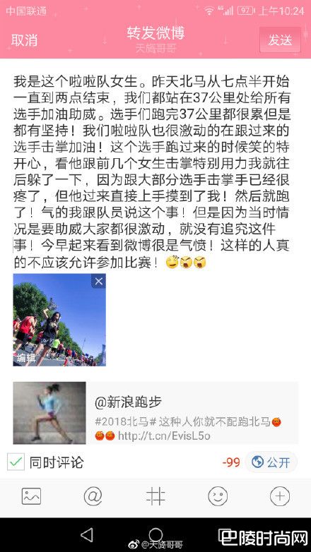 啦啦队员委屈的说,因为我是最后一个啦啦队员,他摸完就跑走了,我当时就跟队友说他摸我,队友赶紧问我没事吧我说没事。有的网友微博质问我当时怎么不说,因为当时在比赛,难道我要追着他跑吗?她表示,现在主办方和组委会在积极帮助她协调这件事,但事情搞得这么大让她有点害怕,但是我的态度还是坚决报警。
