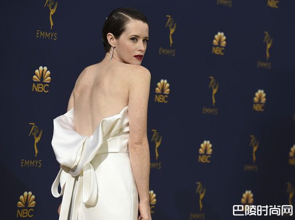 《王冠》演出英国女王伊莉莎白二世的克莱尔芙伊穿着白色礼服,后方挖空设计露出白皙性感美背