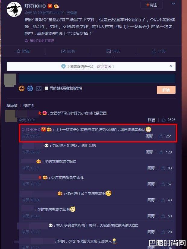 爆料人透露,现在大陆娱乐圈内,限娘令已悄悄开始发酵,像是几天前东方卫视播出的《下一站传奇》,第一次录影就把许多略娘的选手淘汰掉了。他还在贴文中透露,现在还有个潜规则,就是以后不能说偶像、练习生、男团、女团这些字眼,种种不成文的规定,让不少大陆网友看了也傻眼,直喊夸张,该博主也透露,现在也不能说男、女团,要改称战队。