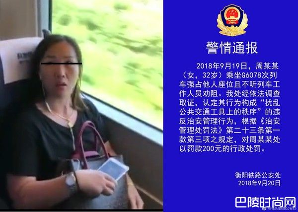 横杨铁路公安处发布警情通报,周某某(女,32岁)2018年9月19日乘坐G6078次列车强占他人座位且不听列车工作人员劝阻。行为违反治安管理行为扰乱公共交通工具上的秩序,根据《治安管理处罚法》第二十三条第一款第三项之规定,对她处以罚款200元的行政处罚。