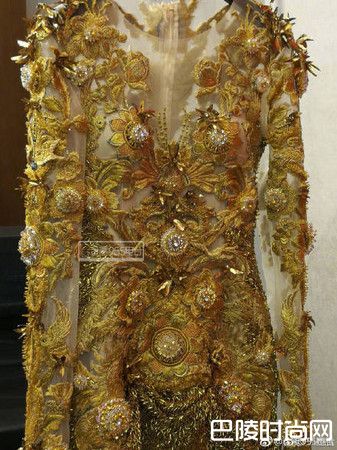 金鹰女神的每年都以金色为主,最新礼服,上半身是绣上的金色花纹,花朵满开绽放、蕊心则是水晶亮片,下半身则是布满金色亮片。而且礼服胸口开深V,镂空花纹下是半透明薄纱,女神身材仍可若隐若现。