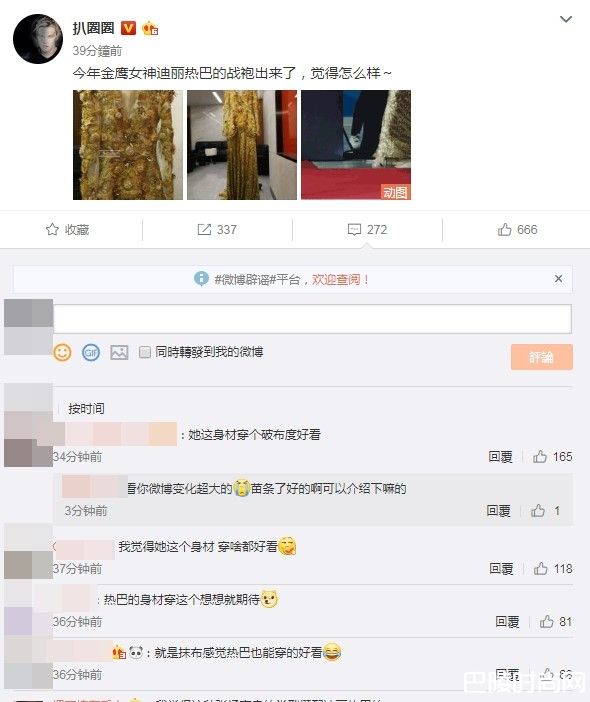 金鹰女神的服装抢先曝光,金色花纹被联想到向日葵,网友反问她穿啥会不好看、她这身材穿个破布都好看、她穿纸大概都好看。还有网友翻出迪丽热巴穿金色礼服走红毯的画面,期待女神惊艳全场。