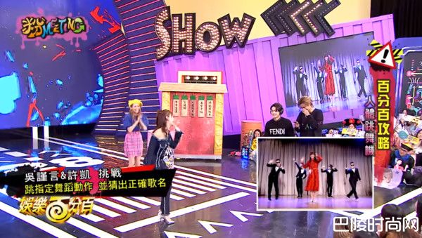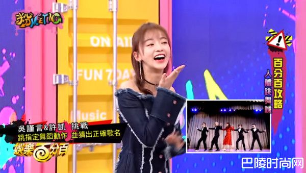 吴谨言和许凯一组挑战人体跳舞机,许凯带着耳机听不到现场音乐,她则要看大萤幕模仿里面的舞蹈,再由对方猜出歌曲名,第一题虽然顺利看懂TFBOYS《青春修炼手册》的舞蹈,可惜说错歌名,还好靠着粉丝暗示猜中第二题《小苹果》,第三题成了关键题,许凯放话绝对不靠提示,结果竟然是朱碧石的夯曲《你干嘛》。